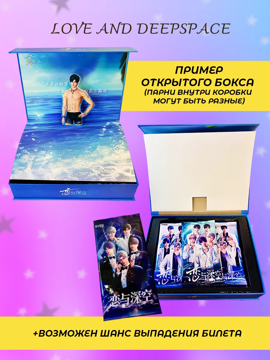Коллекционные карточки аниме Love and Deepspace. Данный бокс включает в себя 12 упаковок карточек + бонусный бустер. В каждом бустере по 2 карты, всего 24 карт. В подарок идет случайный значок