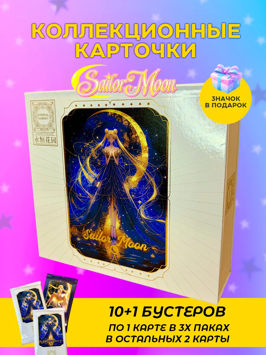 Коллекционные карточки аниме Сейлор Мун. Данный бокс включает в себя 10+1 упаковок карточек. В каждом бустере по 1-2 карты, всего от 20 карт. В подарок идет случайный значок