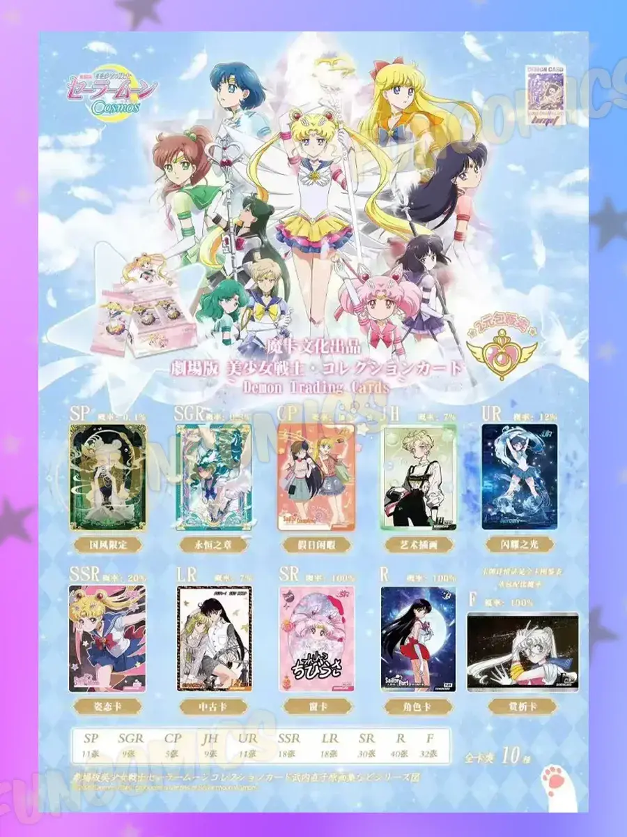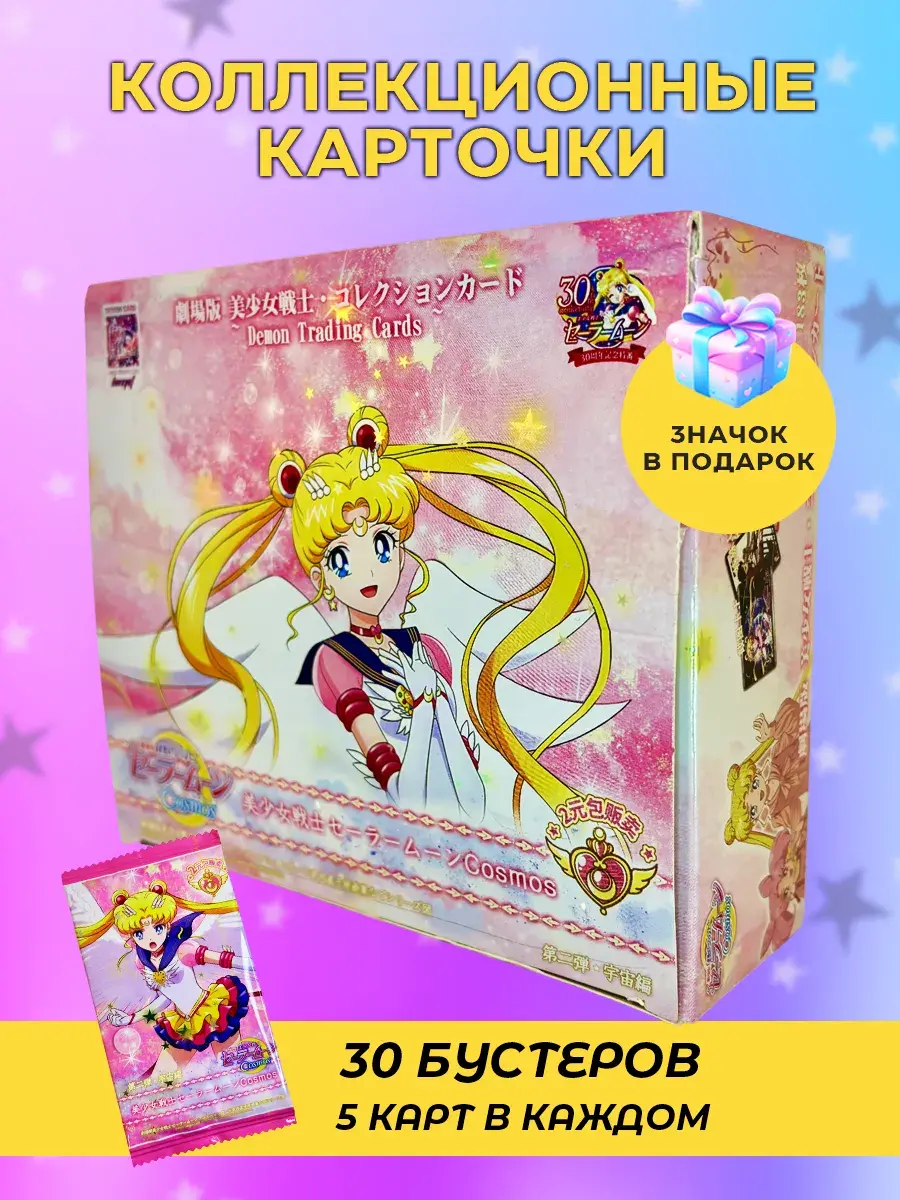 Коллекционные карточки аниме Сейлор Мун. Данный бокс включает в себя 30 упаковок карточек. В каждом бустере по 5 карт, всего 150 карт. В подарок идет случайный аниме значок