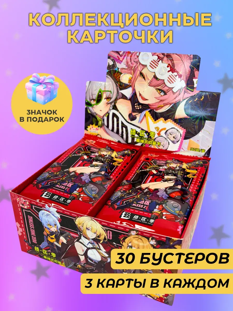В коробке карточек Zenless Zone Zero 30 бустеров с карточками, 2 пластиковых протектора и случайная аниме открытка, в каждом бустере по 3 карточки