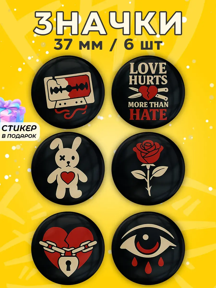 Набор значков Emo Edition — это комплект из шести металлических значков диаметром 37 мм в стиле emo, punk и альтернативной эстетики. Каждый значок разработан в узнаваемой красно-бежевой цветовой гамме и имеет четкий графический дизайн: кассета с лезвием, фраза Love Hurts More Than Hate, эмо-зайчик, алый цветок розы, разбитое сердце, стянутое цепями, и глаз с каплями.
